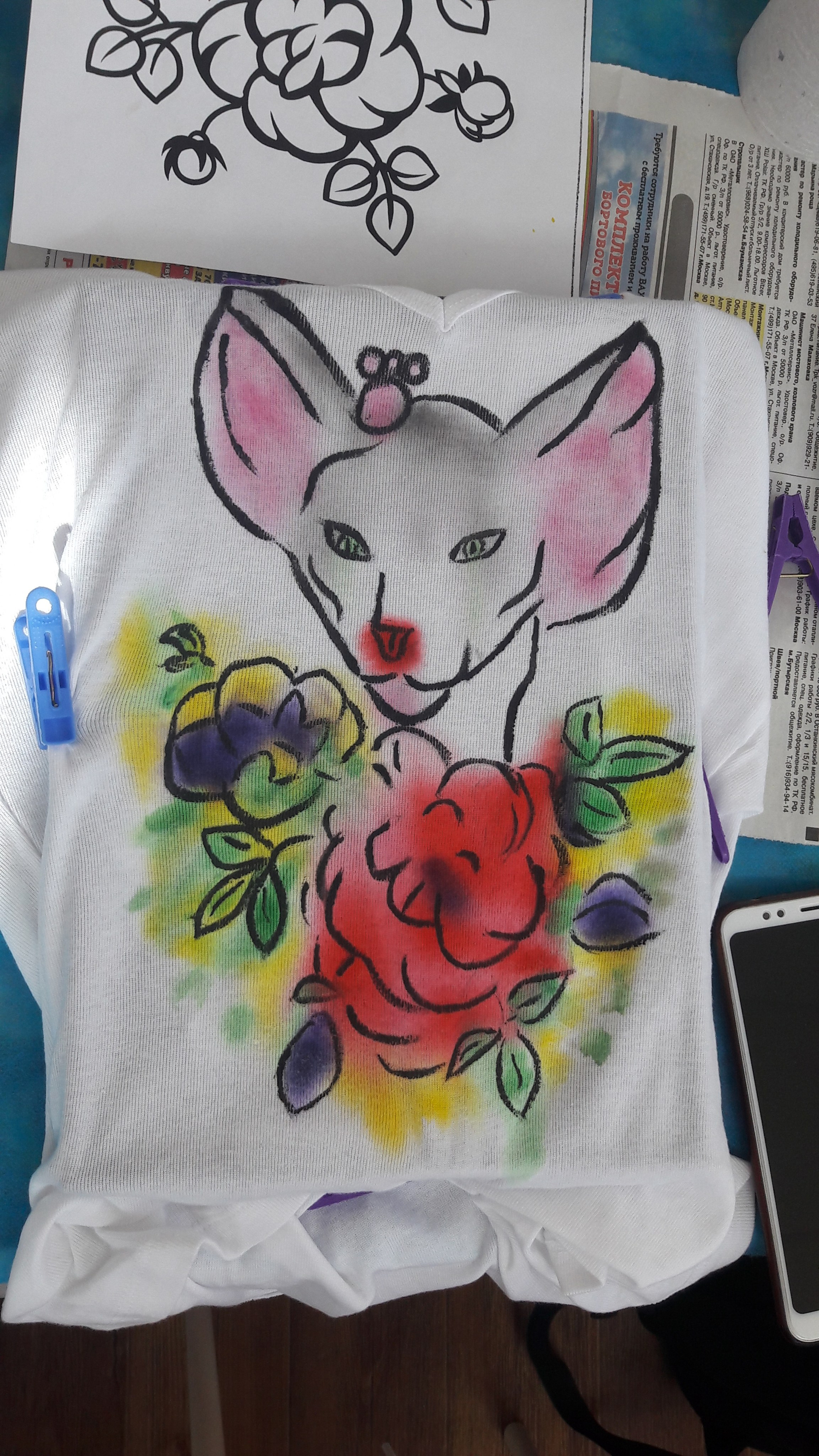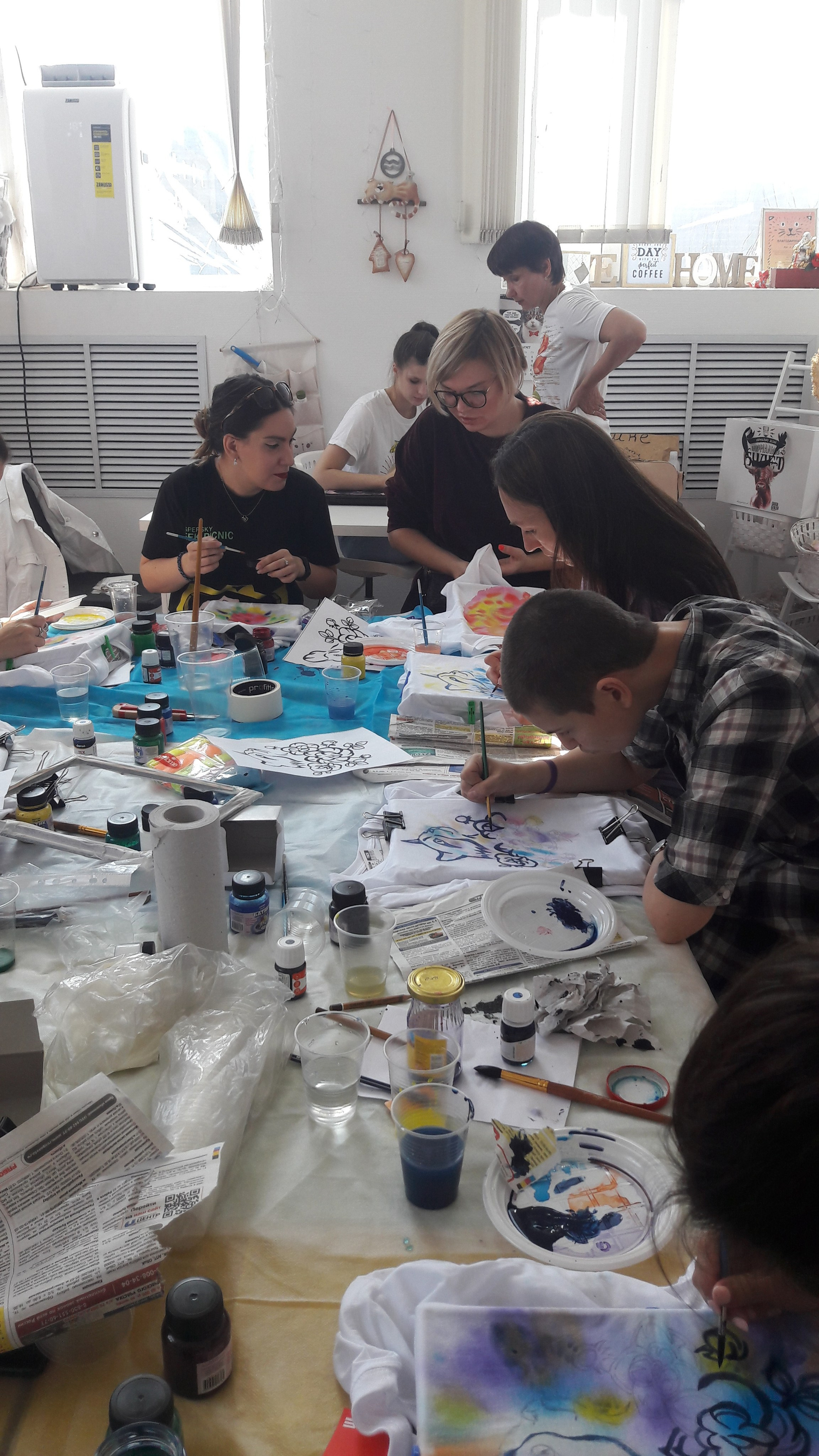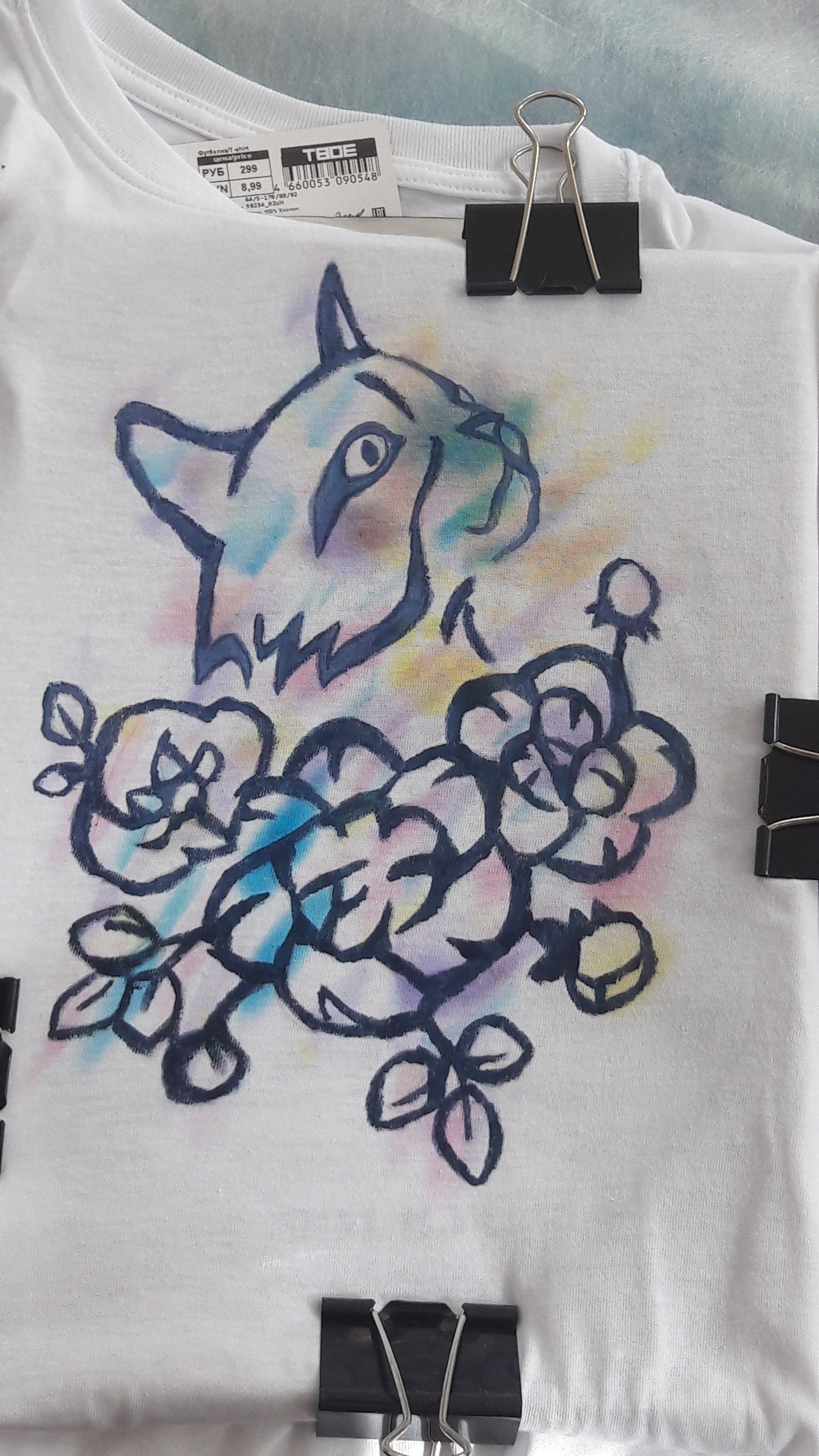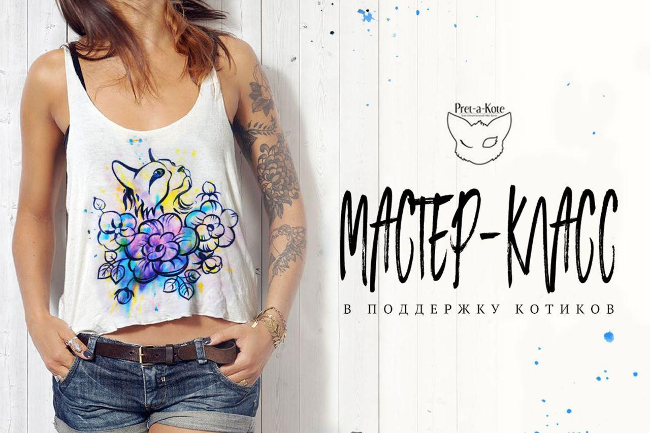 В 2019 году совместно с благотворительный «Мяу-Бутиком Pret-a-Kote» я организовала и провела мастер-класс в поддержку бездомных животных. Участники познакомились с техникой холодного батика и попрактиковались в росписи футболок.